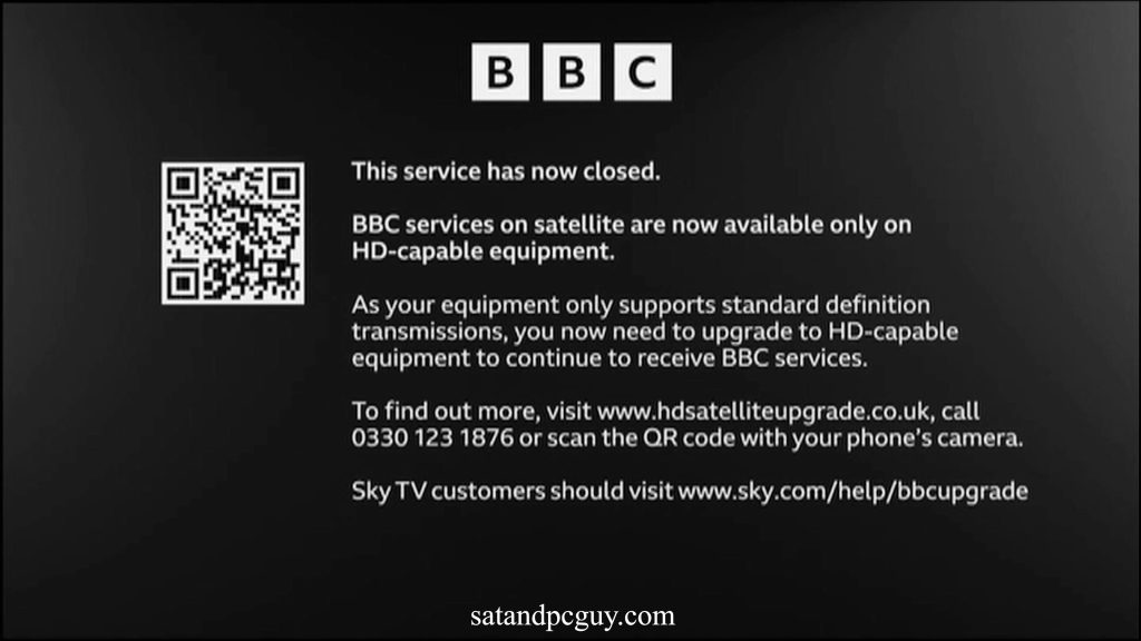 The BBC SD service closed message reads “This service has now closed. BBC services on satellite are now available only on HD-capable equipment. As your equipment only supports standard definition transmissions, you now need to upgrade to HD-capable equipment to continue to receive BBC services”