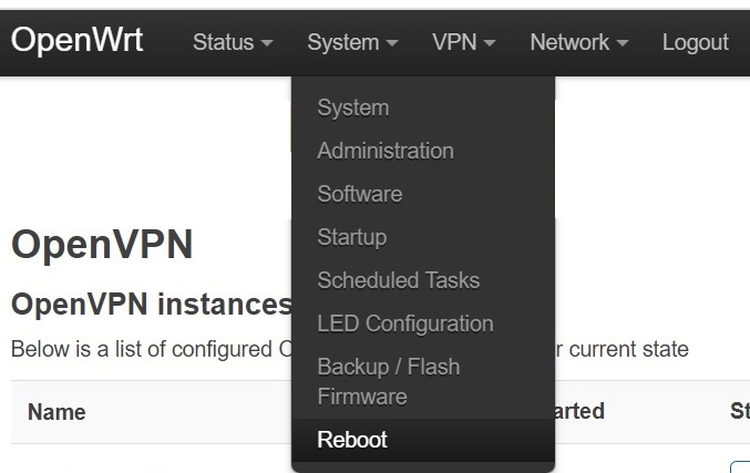 11. On the OpenWRT toolbar, Click System, and select Reboot.