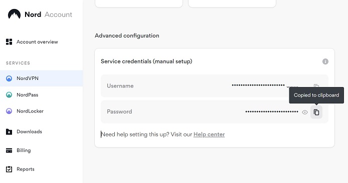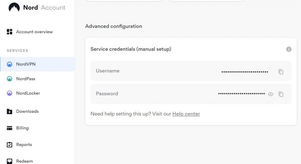 2. Click on NordVPN in the Services section on the left hand side of the screen. Then scroll down the page until you see the Services Credentials section.