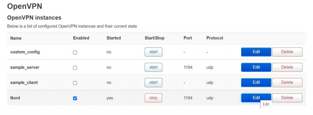8. Find the line for the NordVPN “instance”, and click on Edit